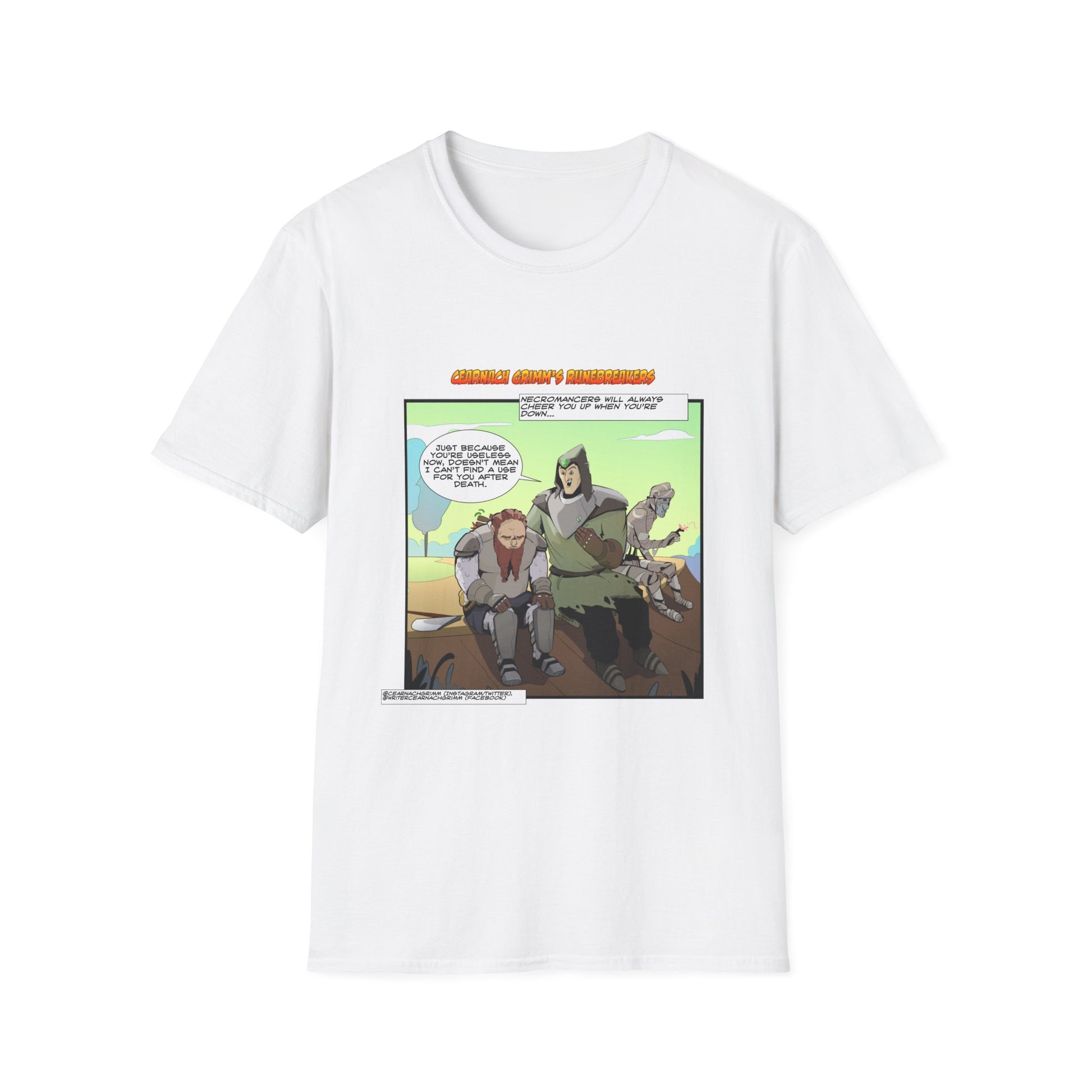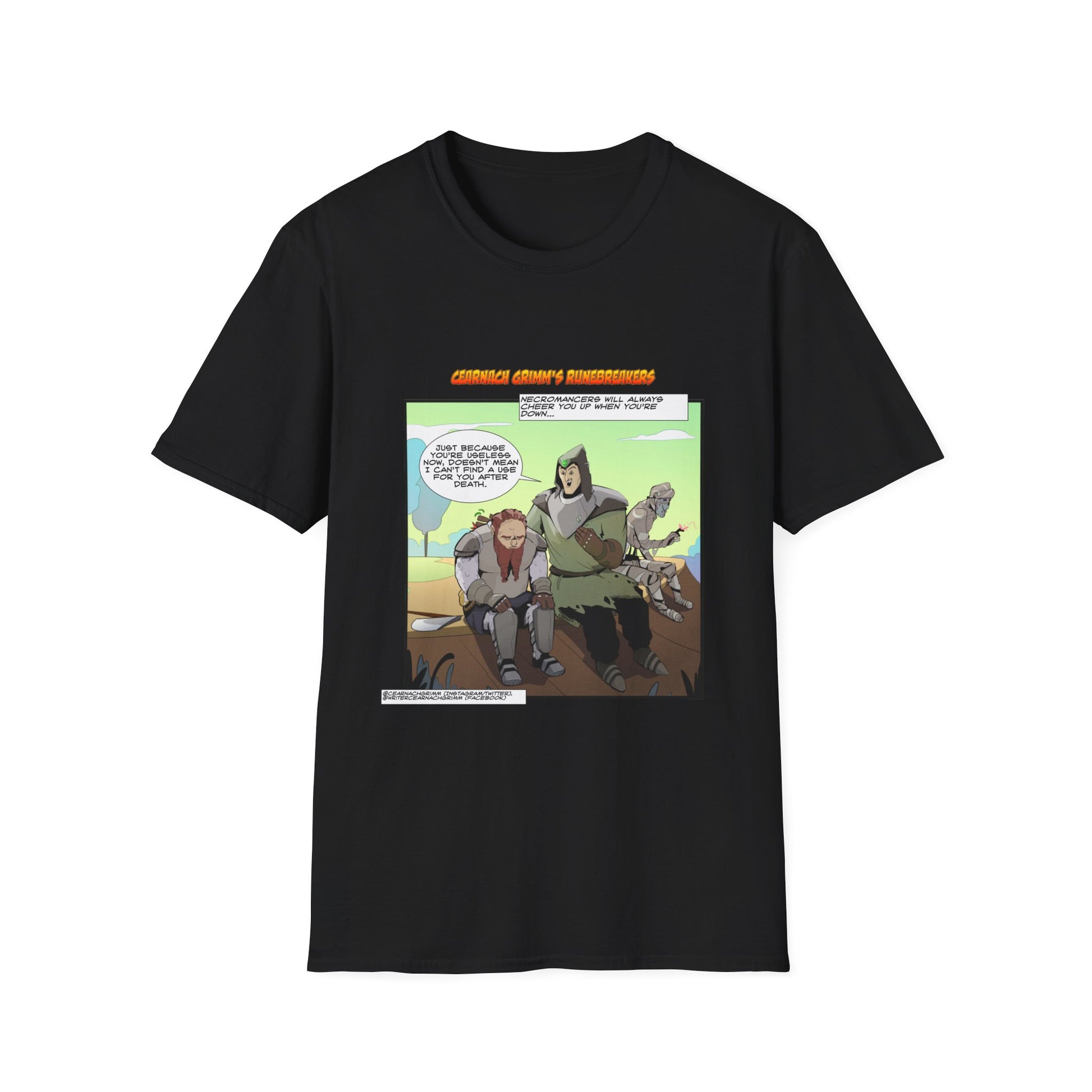 Experience Everyday Comfort with a Touch of Adventure! Get ready to blend style, comfort, and a bit of humor with our unisex soft-style t-shirt featuring the Runebreakers single-panel comic, "Necromancer's Comfort." Ideal for those who appreciate a playful twist on casual wear, this tee is much more than just clothing—it's a way to express your sense for the right quest.